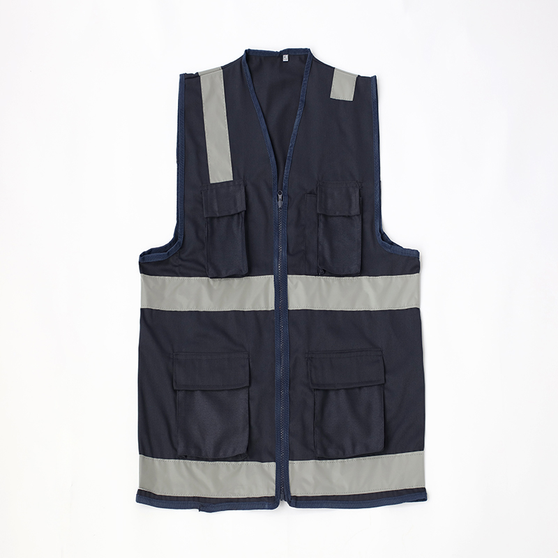 Chaleco azul marino en drill , con cintas reflectivas para alta visibilidad. Amplio, cómodo y resistente. Ideal para trabajos pesados o ambientes de riesgo.