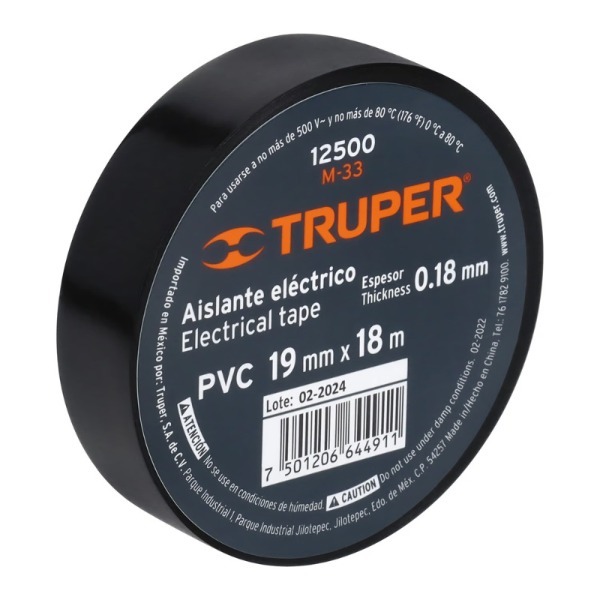 Cinta aislante color negro Truper de 18mm x 19mm. Alta adherencia y resistencia para trabajos eléctricos o de reparación. Ideal para uso profesional o doméstico.
