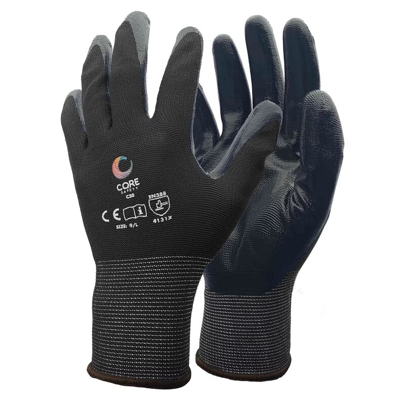Guantes industriales palma de nitrilo, modelo C30, marca Core.